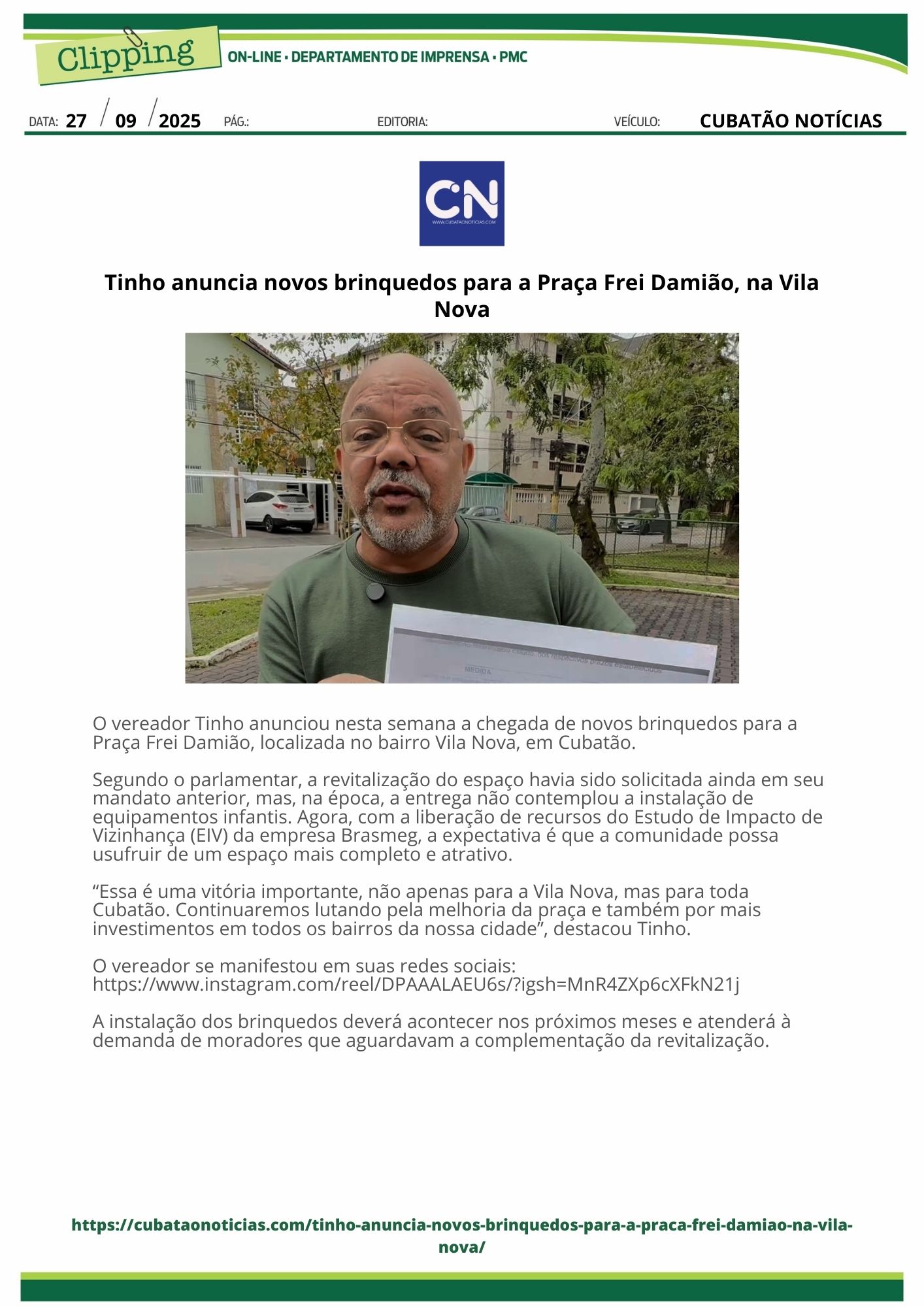 • Praça dos Emancipadores, s/nº - Centro - Cubatão/SP - CEP 11510-900
