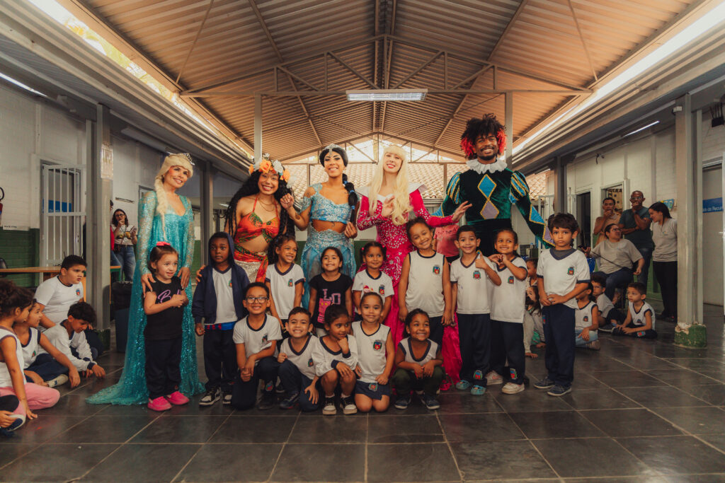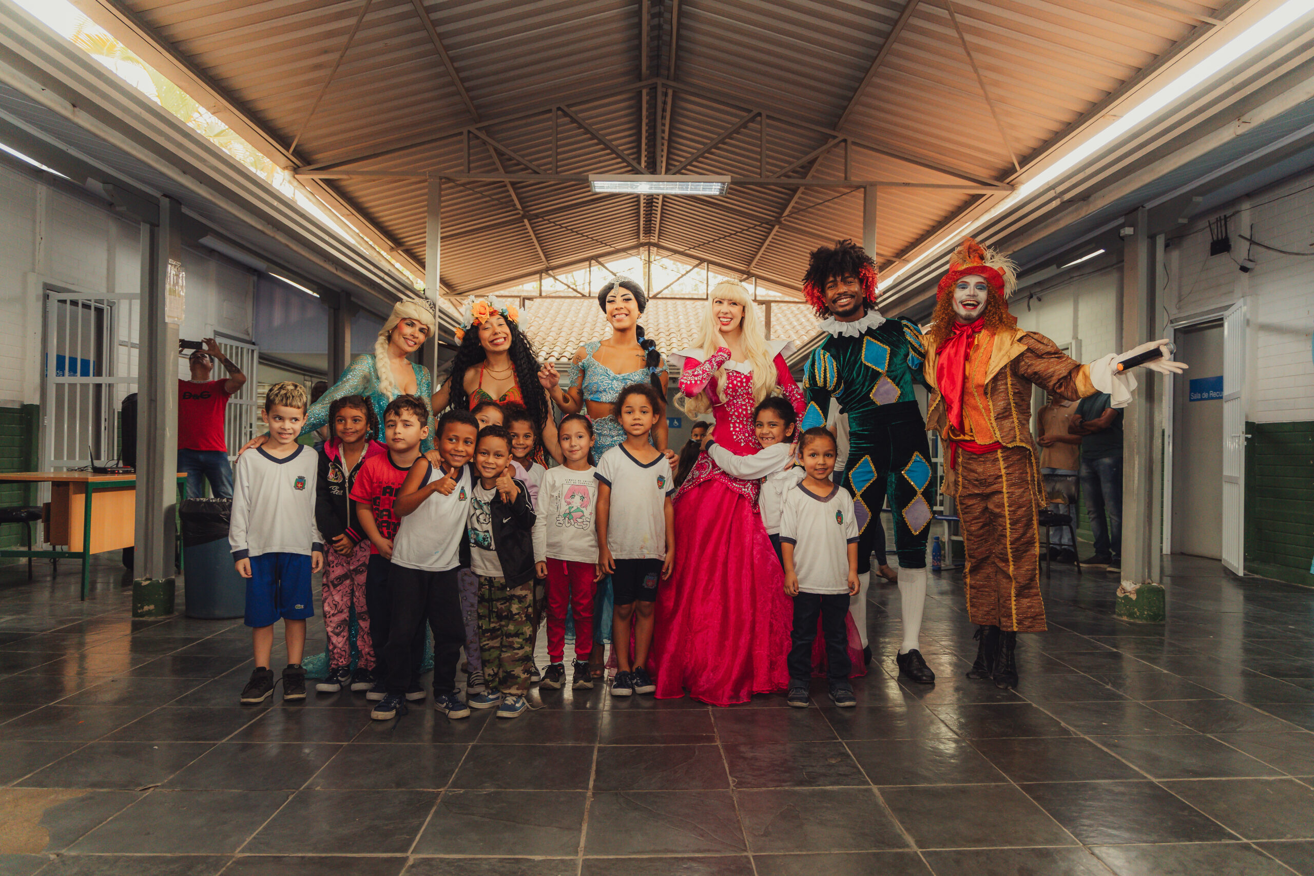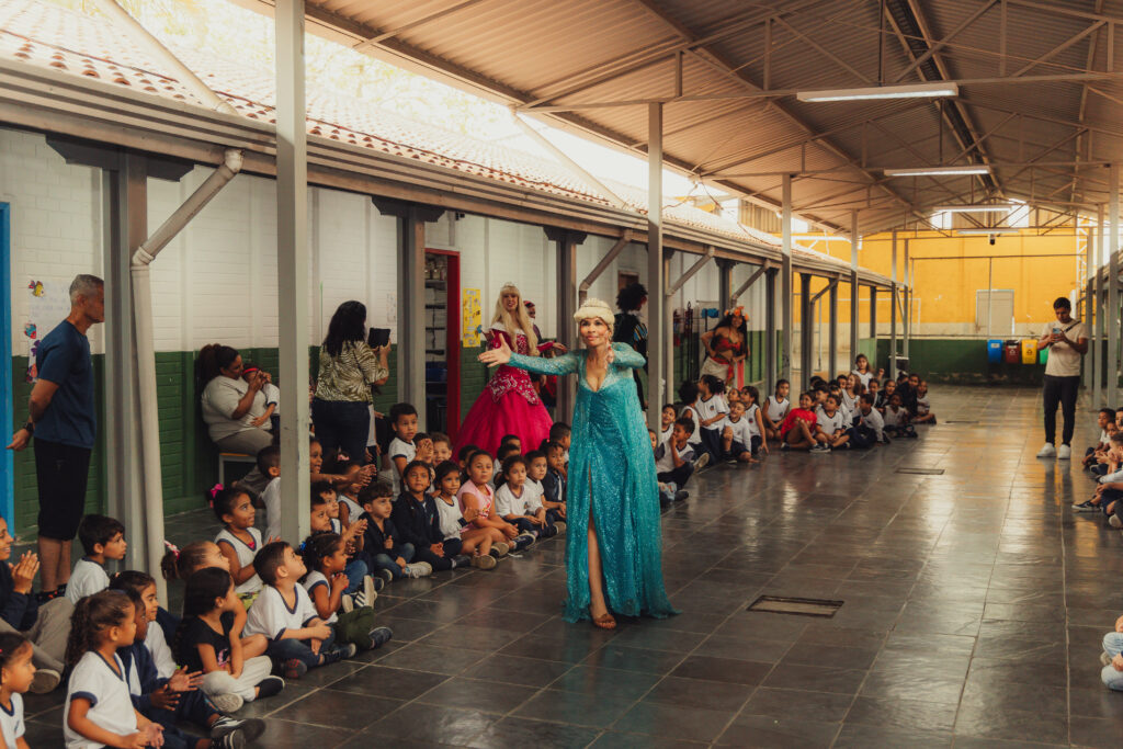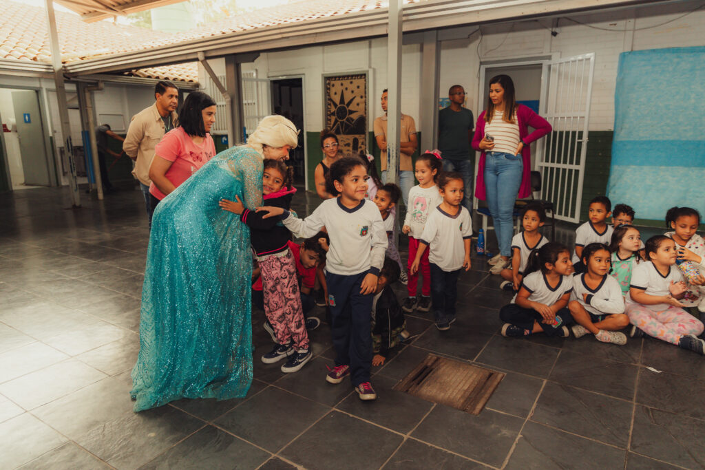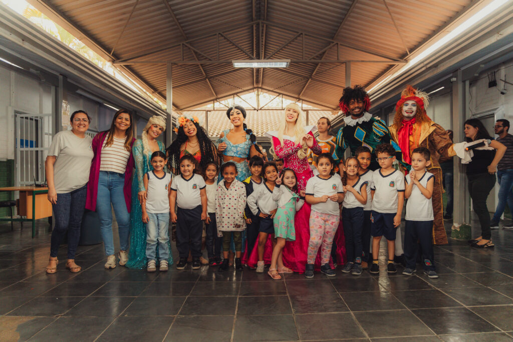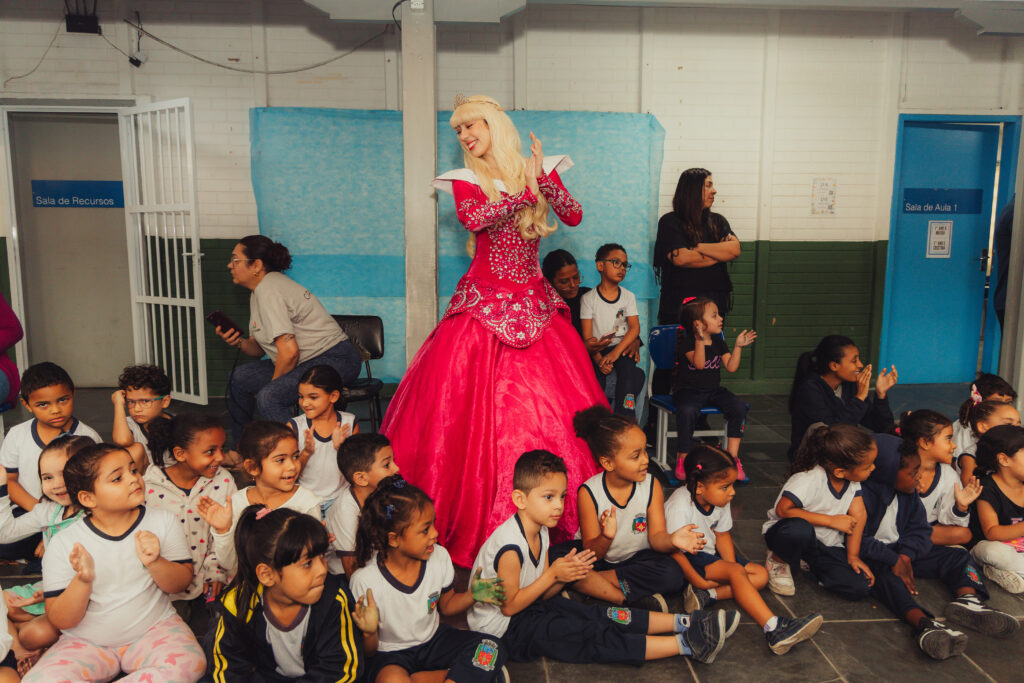Uma pausa nos estudos para o Chá com as Princesas: Aurora, Elsa, Jasmine, Moana, acompanhadas do Chapeleiro Maluco e do Bobo da Corte. Na manhã desta quinta-feira (2), cerca de 140 crianças do ensino infantil e do 1º e 2º ano do fundamental da UME Elza Silva dos Santos, na Vila Esperança, se divertiram com os personagens infantis da literatura e do cinema, transformando o pátio da escola em um reino encantado. “Eu adorei ver a Aurora”, comentou a pequena Yasmin, de 6 anos.