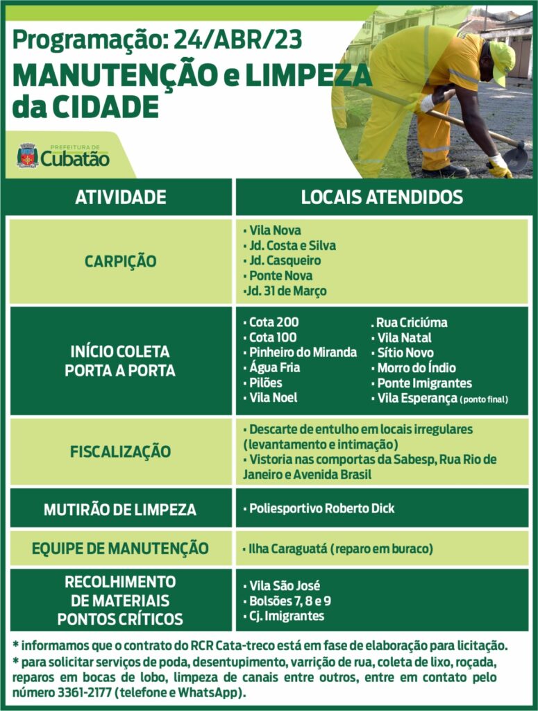 Cronograma de segunda-feira (24) dos serviços de manutenção e limpeza da cidade