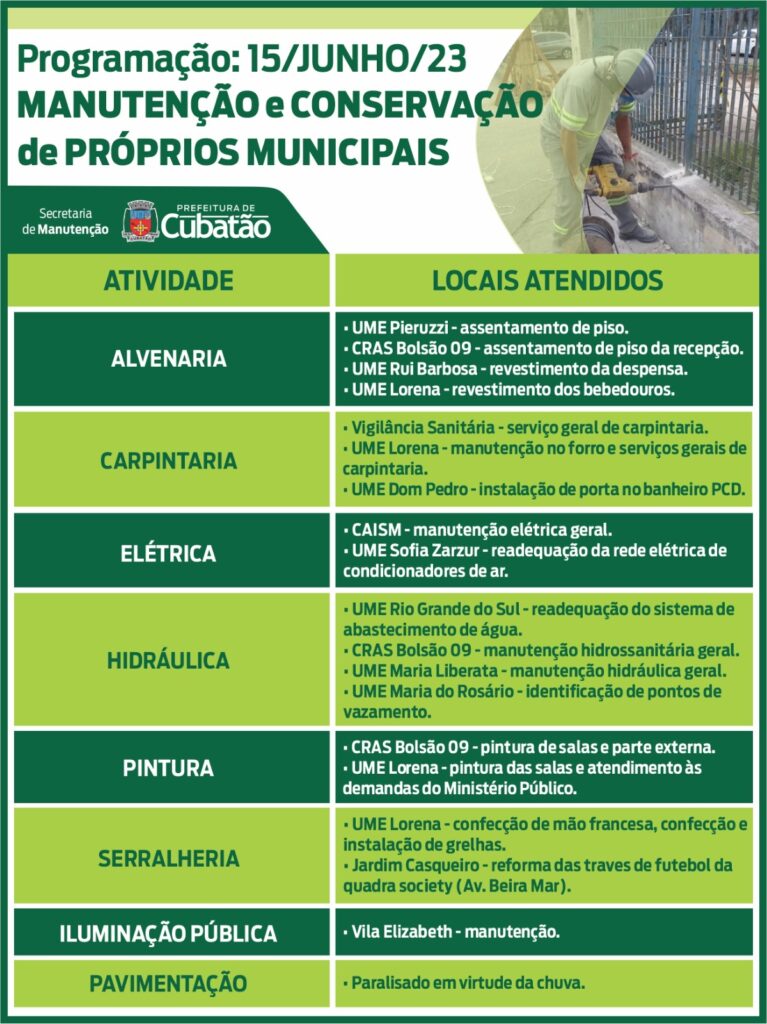 Cronograma dos serviços de manutenção e conservação dos próprios municipais desta quinta-feira (15/6)