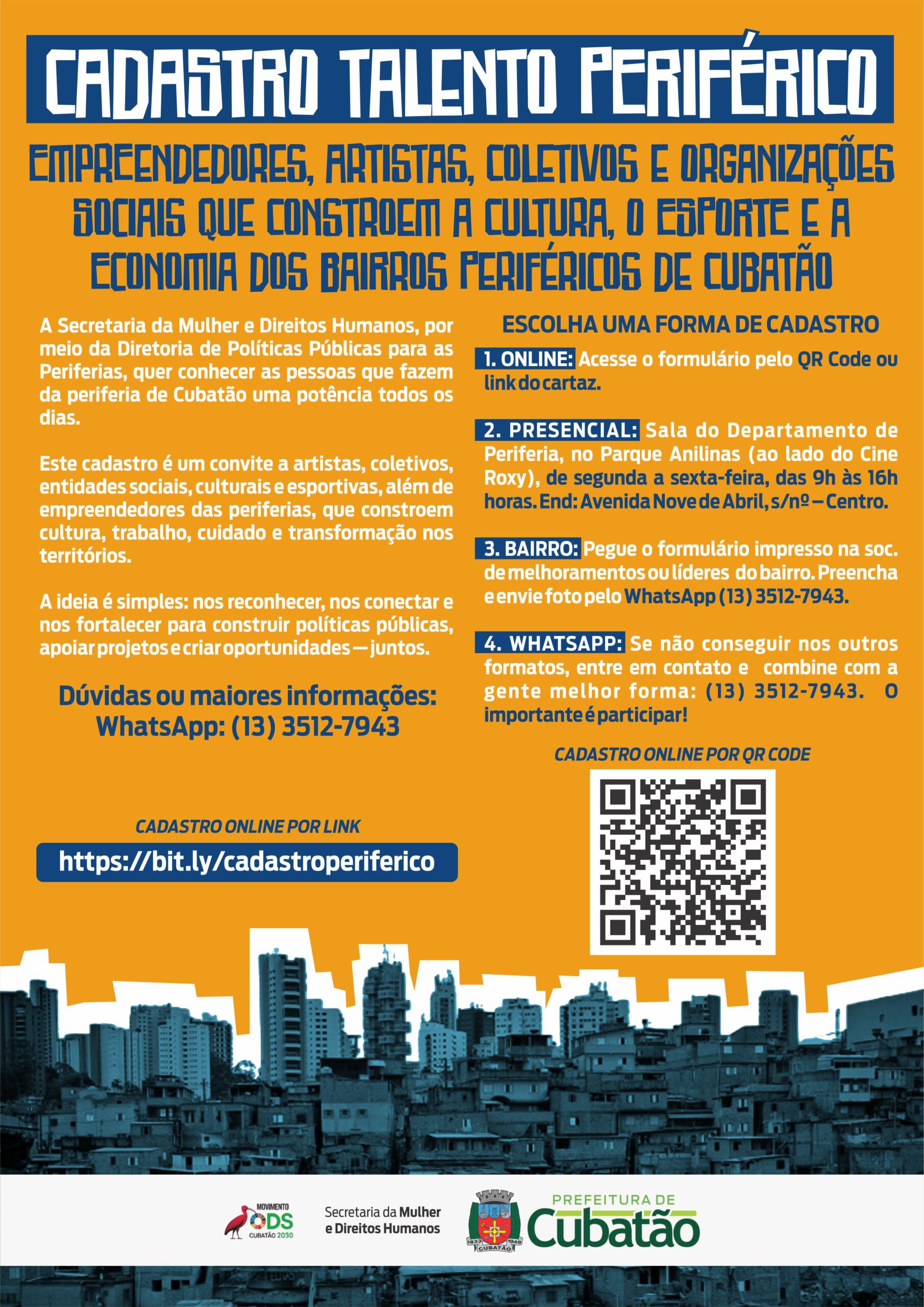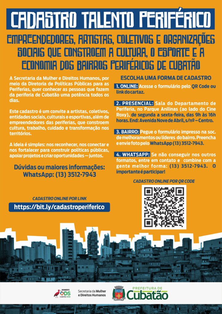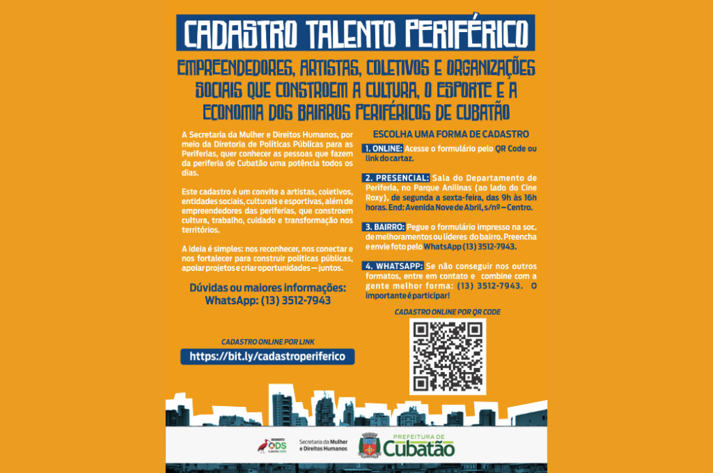 A Prefeitura de Cubatão (PMC), por meio da Secretaria da Mulher e dos Direitos Humanos – via Diretoria de Políticas Públicas para as Periferias, lançou o Cadastro Simplificado de Artistas, Organizações da Sociedade Civil (OSC), Coletivos e Empreendedores Periféricos. A iniciativa tem como objetivo realizar um mapeamento permanente dos agentes que atuam nos territórios periféricos do município. A medida visa a reconhecer talentos, iniciativas e projetos que contribuam para o desenvolvimento social, cultural, esportivo e econômico da cidade.