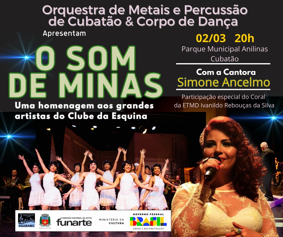 Sob regência do maestro Alexandre Felipe Gomes, o Corpo de Dança com coreografias de Jhully Batista e como peça central, a cantora Simone Ancelmo, dona singular voz em celebração à música brasileira. Também haverá participação do Coral da Escola Técnica de Música e Dança de Cubatão. “O Som de Minas” é uma sincera homenagem aos grandes artistas que fizeram história no Clube da Esquina, um movimento musical que deixou um legado marcante na cultura brasileira.