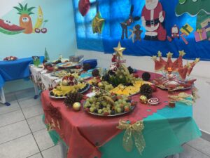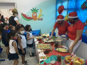 As nutricionistas Raquel Neves, Dayanne Ribeiro e Suzana Ruth Vieira contam que a elaboração do cardápio de Natal foi uma construção e que esta é a primeira vez que um cardápio específico é adotado em toda a rede. “De acordo com as recomendações do PNAE testamos novas receitas ao longo dessa volta presencial às aulas. Então pensamos em pratos festivos, atrativos e saudáveis”. O cardápio das creches – frango assado, farofa rica, salada de legumes com ovos, arroz, feijão e mesa de frutas – já é um padrão e oferecido todos os anos às crianças.
