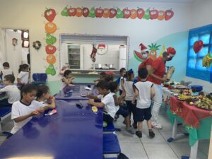 Nesta sexta-feira (10), uma das escolas que receberam a refeição especial foi a UME Estado de Minas Gerais, na Vila Nova. Cerca de 150 crianças, com idade entre 4 e 5 anos, almoçaram na unidade que teve o seguinte menu: fricassê de frango, arroz à grega, batata corada, salada e de sobremesa, pavê de chocolate. A direção da escola também preparou uma mesa recheada de frutas da época.