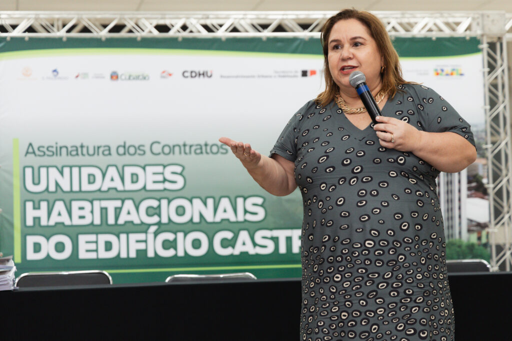 E após a abertura solene, chegou o momento tão esperado da noite: chamar os titulares das 26 famílias presentes. A primeira a ouvir o seu nome e subir ao palco foi Magali Lima Freitas, de 34 anos. Moradora há 24 anos na Vila Esperança e há cinco deles pagando aluguel, a contemplada fez questão de compartilhar a alegria com a mãe e uma amiga. “É um dia memorável. Uma grande conquista em minha vida, a realização de um sonho que esperei com esperança e fé. Ter um lar próprio é, para mim, muito mais que ter um endereço. É ter um espaço onde eu possa construir memória, receber os meus familiares e amigos, descansar tranquilamente e escrever novos capítulos da minha vida”, relatou a contemplada, já com o contrato assinado e em mãos.