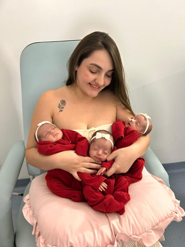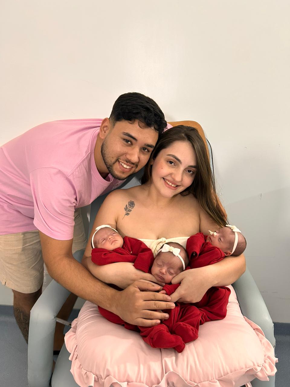 Como previsto, o parto ocorreu de forma antecipada, no dia 3 de março. Luísa nasceu às 16h49, pesando 1,625 kg; Lara nasceu às 16h50, com 1,535 kg; e Lorena nasceu às 16h52, com 1,156 kg. Inicialmente, as bebês foram encaminhadas para a Unidade de Terapia Intensiva (UTI) neonatal, devido ao nascimento prematuro. “Entre as estratégias utilizadas durante esse período podemos destacar o estímulo ao ‘Método Canguru’, com a participação ativa dos pais, que favorece o vínculo, a estabilidade clínica e o ganho ponderal das trigêmeas. Também foram empregadas a colostroterapia e o aleitamento materno, fundamentais para fortalecer a imunidade e contribuir para o desenvolvimento saudável das bebês”, relata a supervisora de enfermagem Materno-Infantil do Hospital Municipal de Cubatão, Daniela Souza.