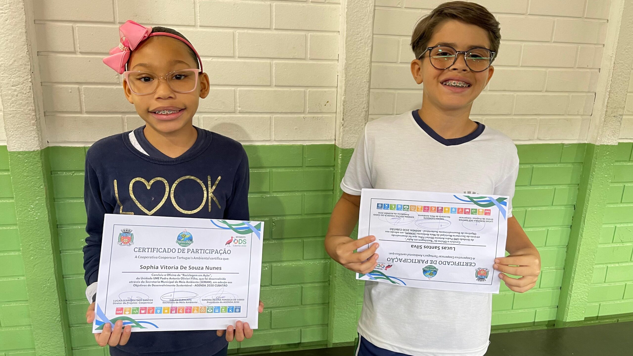 Nesse dia, foram entregues os certificados aos 60 alunos participantes da Oficina de Reciclagem só dessa unidade. Entre as crianças, estavam Sophia Vitória de Souza Nunes e Lucas Santos Silva, de 10 anos de idade, ambos do 4º ano B. “Achei muito legal o fato de podermos dar um outro destino para o lixo, ver que nem tudo se joga fora, que podemos reaproveitar de outra forma e que isso contribui com o meio ambiente”, relatou Sophia.