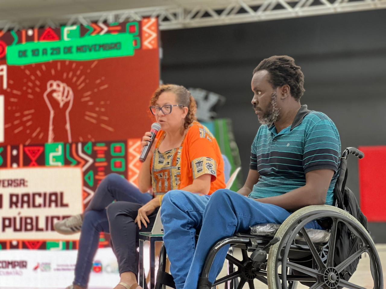 Além da titular da pasta, compuseram a mesa os servidores Júlio Evangelista Santos Júnior, chefe da Divisão de Articulação Estratégica e Intersetorial em Políticas de Igualdade Racial e coordenador da Câmara Temática de Direitos Humanos do Condesb; Magali Pereira, professora, coordenadora pedagógica e membro Núcleo de Educação para Relações Étnico-Raciais do (Nerer), da Seduc; Natali Ribeiro, presidente do Compir; João Roberto Filho, técnico administrativo, membro do Compir e da Unegro (União de Negros e Negras pela Igualdade); Samuel Lira, diretor do Departamento de Políticas para Igualdade Racial e Étnica.