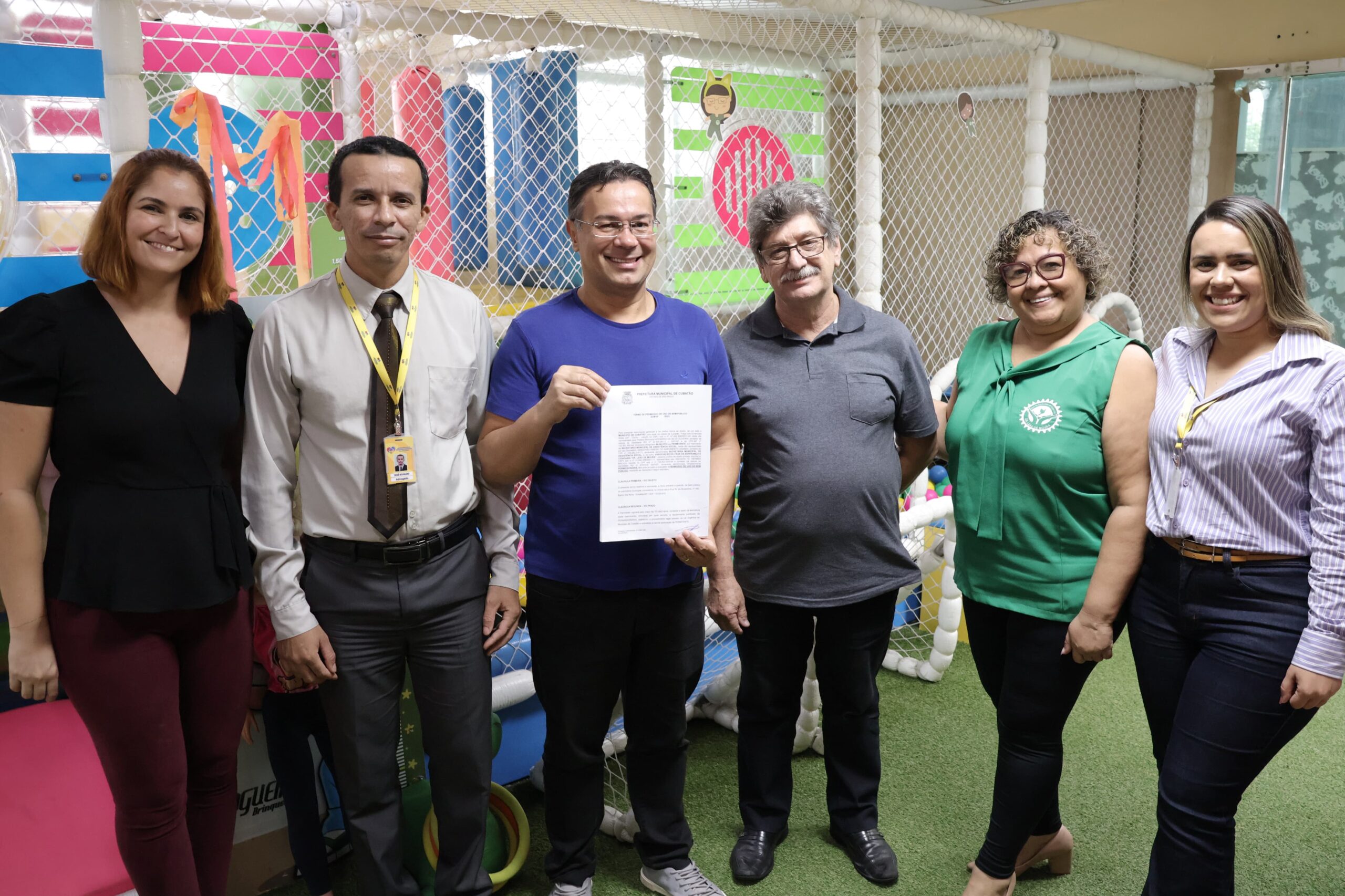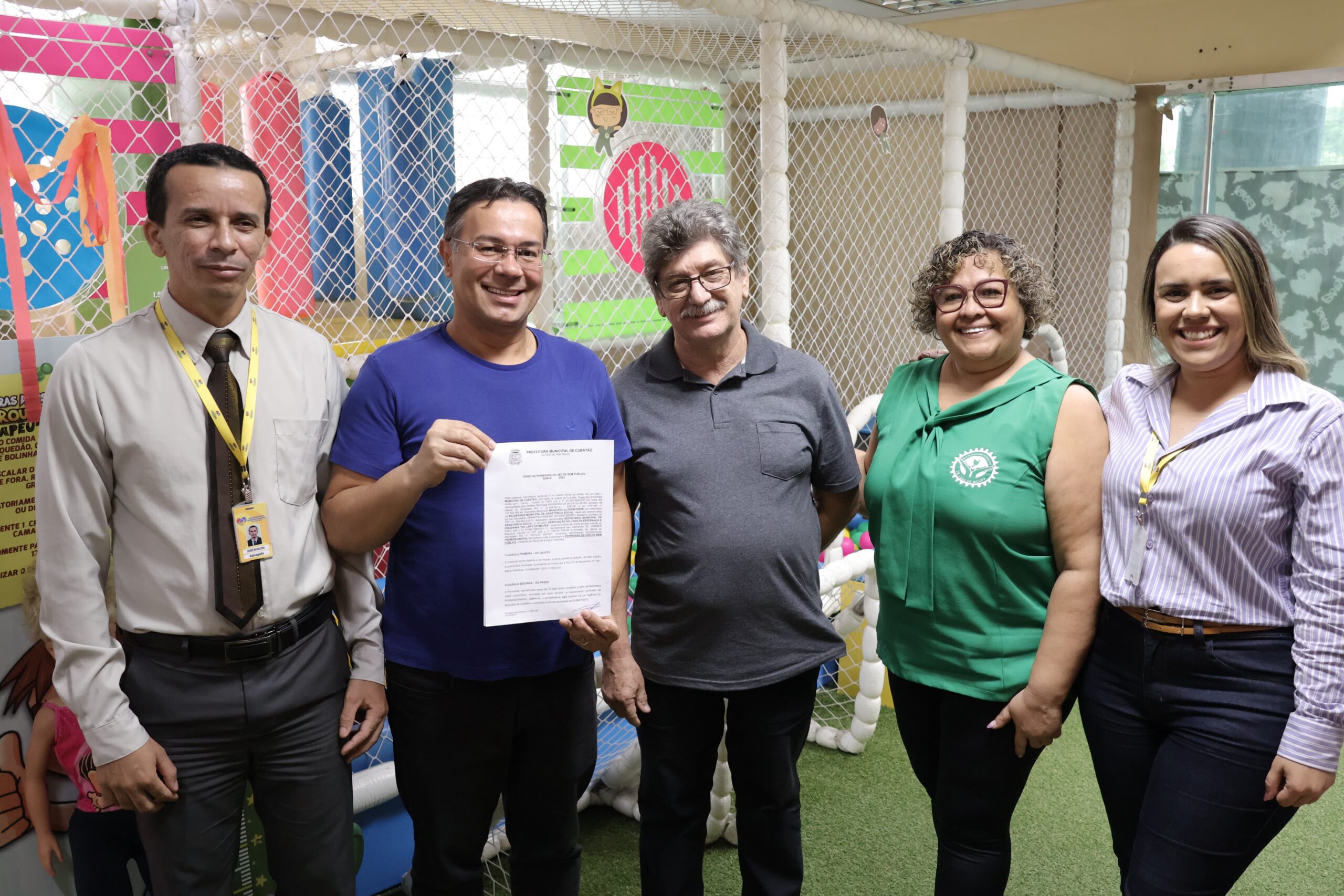 O ato de assinatura também contou com a presença de Renata Almeida, chefe de Gabinete do prefeito, Talita Guedes, do Desenvolvimento Institucional da Casa, Rosa Rodrigues, gerente, e Rivaldo Silva, do Jurídico.