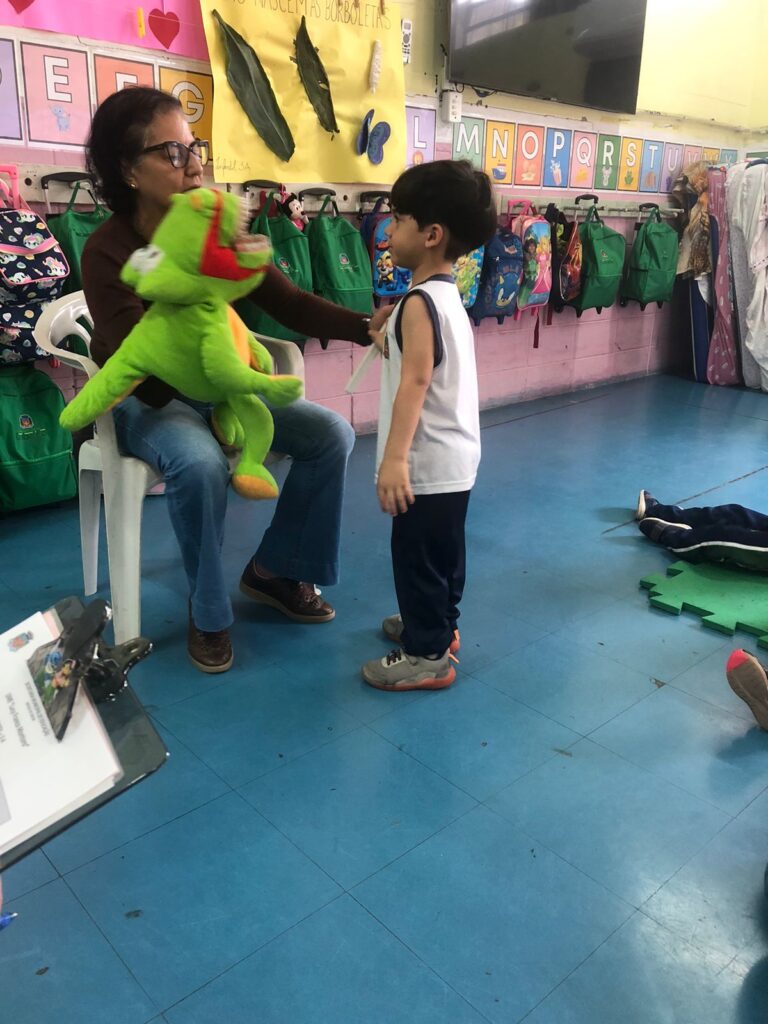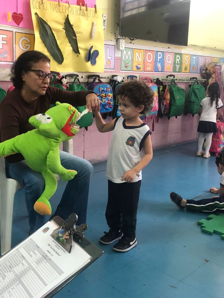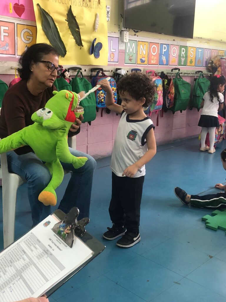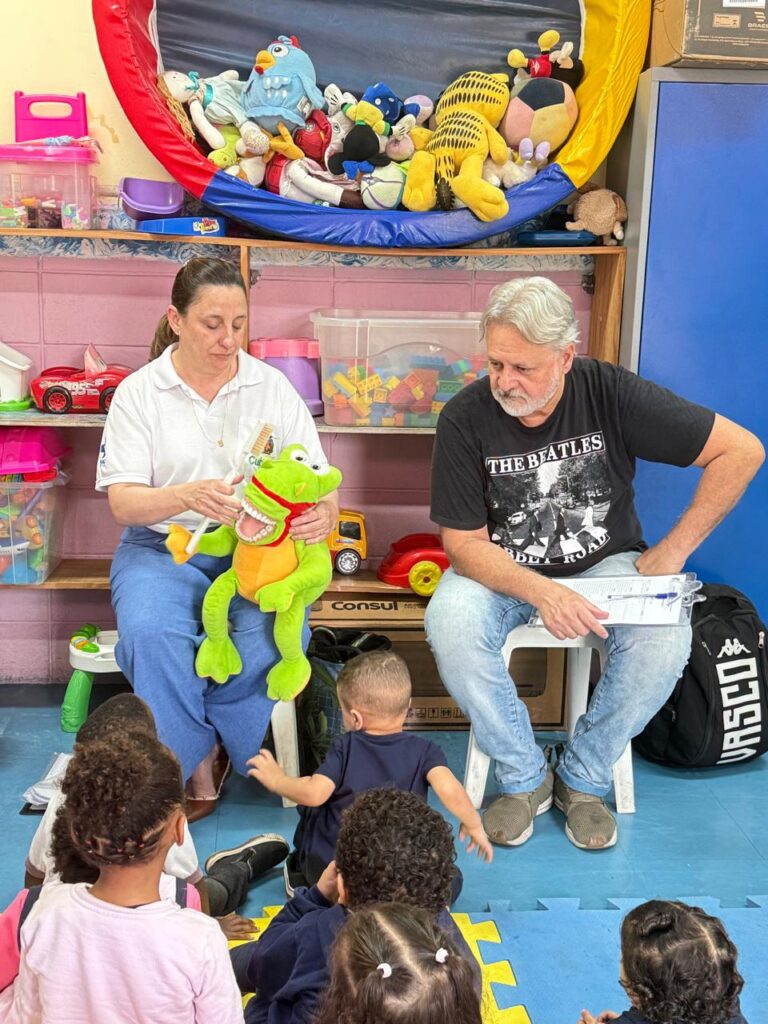 Na segunda-feira (8/9), a UME Lucy Montoro sediou uma ação de Saúde Bucal, conduzida pelo odontólogo Dr. Rogério Pedroso (ESF Área 5) e pela Dra. Silvia Marme (equipe de Prevenção em Odontologia). Com apoio de recursos lúdicos, como um fantoche em formato de jacaré com dentes, as crianças aprenderam de forma prática e divertida a importância da higiene bucal.