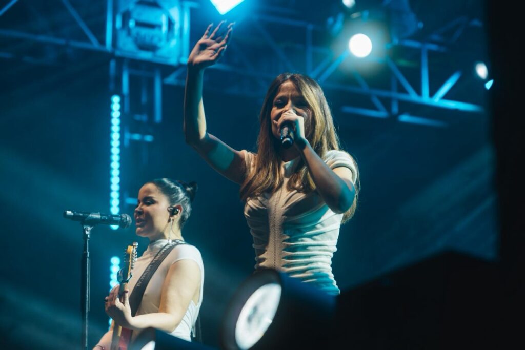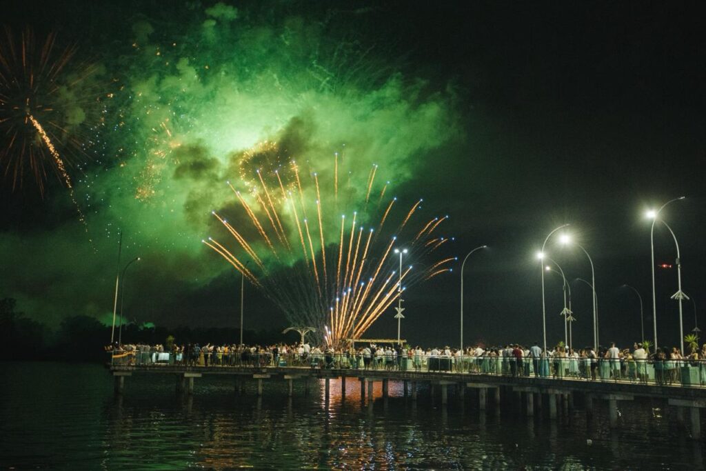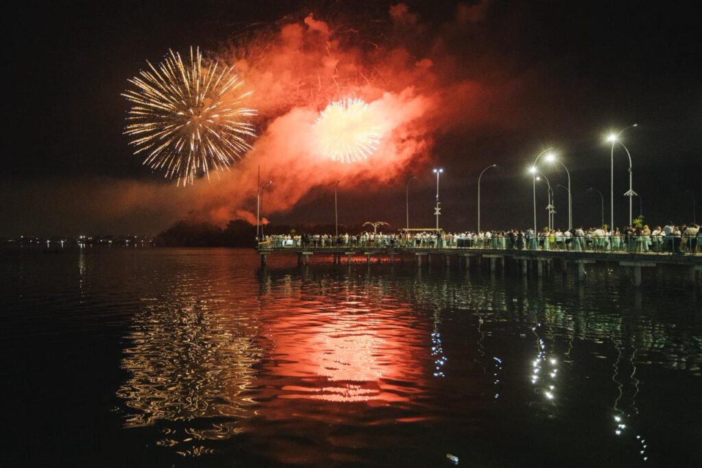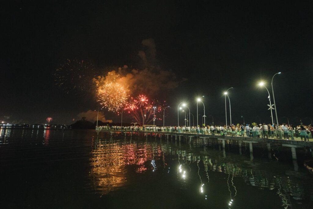 A dupla sertaneja, uma das mais queridas do Brasil, conduziu a contagem regressiva para 2026 de forma emocionante. Ao fundo, cerca de 3,5 toneladas de fogos de artifício sem estampido iluminaram o céu da cidade durante 15 minutos. Entre cumprimentos, brindes e abraços do público presente, Maiara e Maraísa interpretaram sucessos como “Medo Bobo”, “Sorte que Cê Beija Bem” e “A Culpa é Nossa”. As artistas ainda foram surpreendidas no palco com um “Parabéns pra Você”, com a presença do prefeito César Nascimento e da vice-prefeita Andrea Castro, em um momento marcado por bolo de festa e celebração.