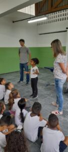 A palestra voltada para as crianças teve como tema principal a reciclagem. Professoras e outros colaboradores da escola também participaram da conversa, promovendo interação com os alunos. Como parte das atividades, um vídeo foi exibido relacionado ao assunto e a criança pode conhecer brinquedos preparados com material reciclado. Os estudantes confeccionaram petecas com jornal para que, por meio da dinâmica, entendessem na prática o tema.