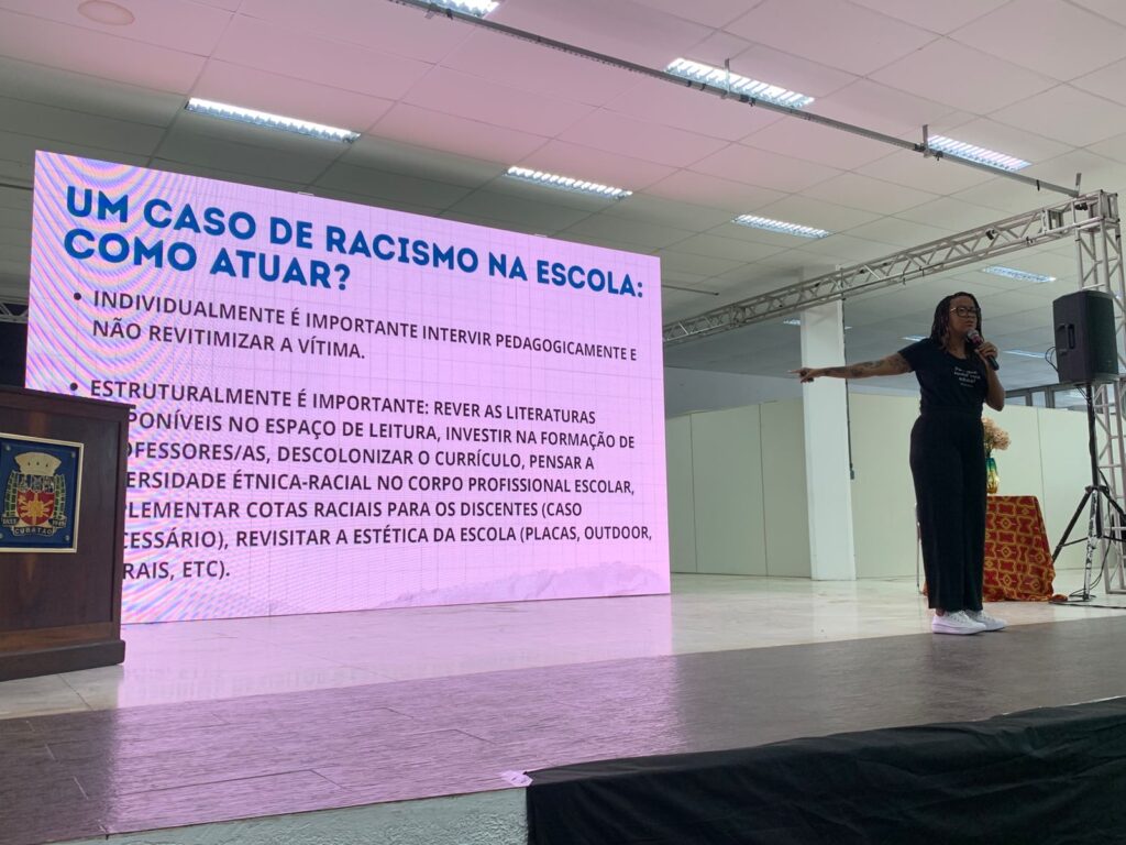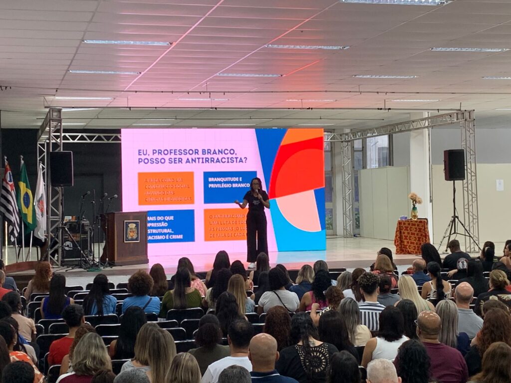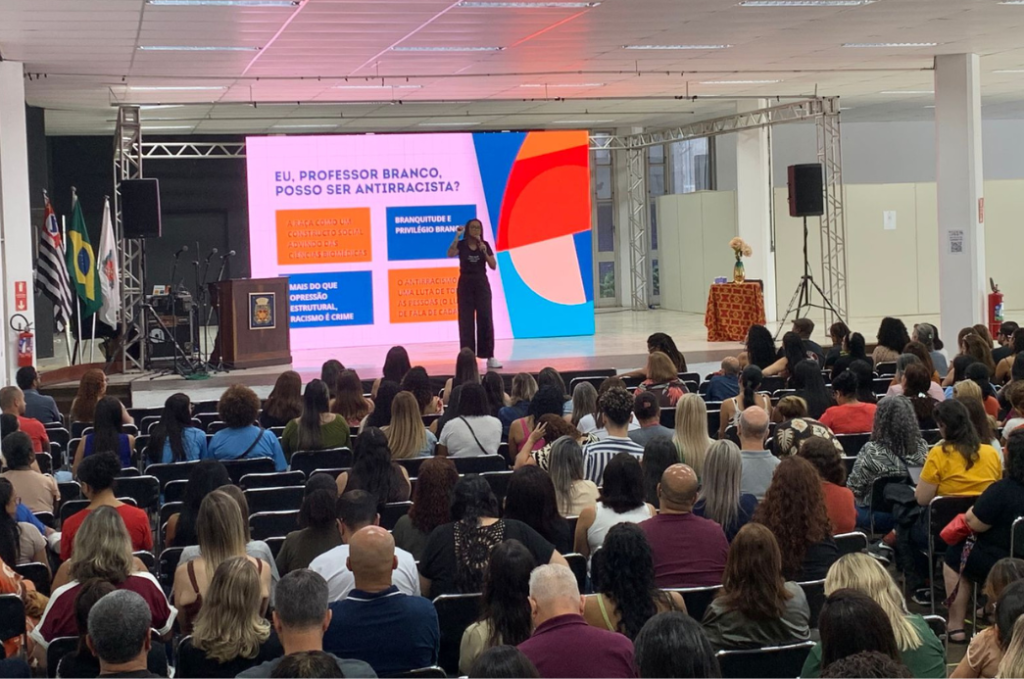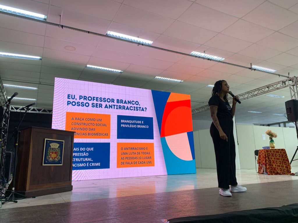 Os educadores acompanharam a palestra magna “Como ser um educador antirracista”, ministrada pela escritora e educadora Barbara Carine. Professora efetiva da Universidade Federal da Bahia (UFBA) e uma das vozes mais influentes no debate sobre relações raciais e educação no Brasil, Barbara Carine foi vencedora do Prêmio Jabuti 2024, na categoria Educação, com o livro que dá nome à palestra e trouxe à luz reflexões importantes aos profissionais presentes.