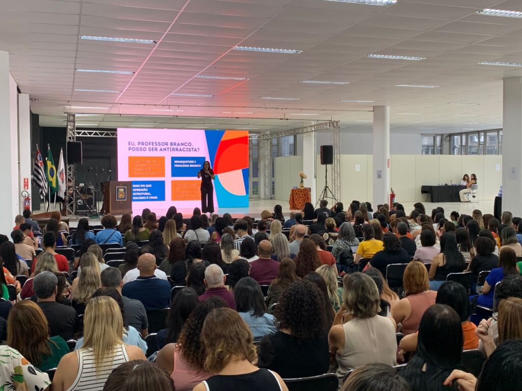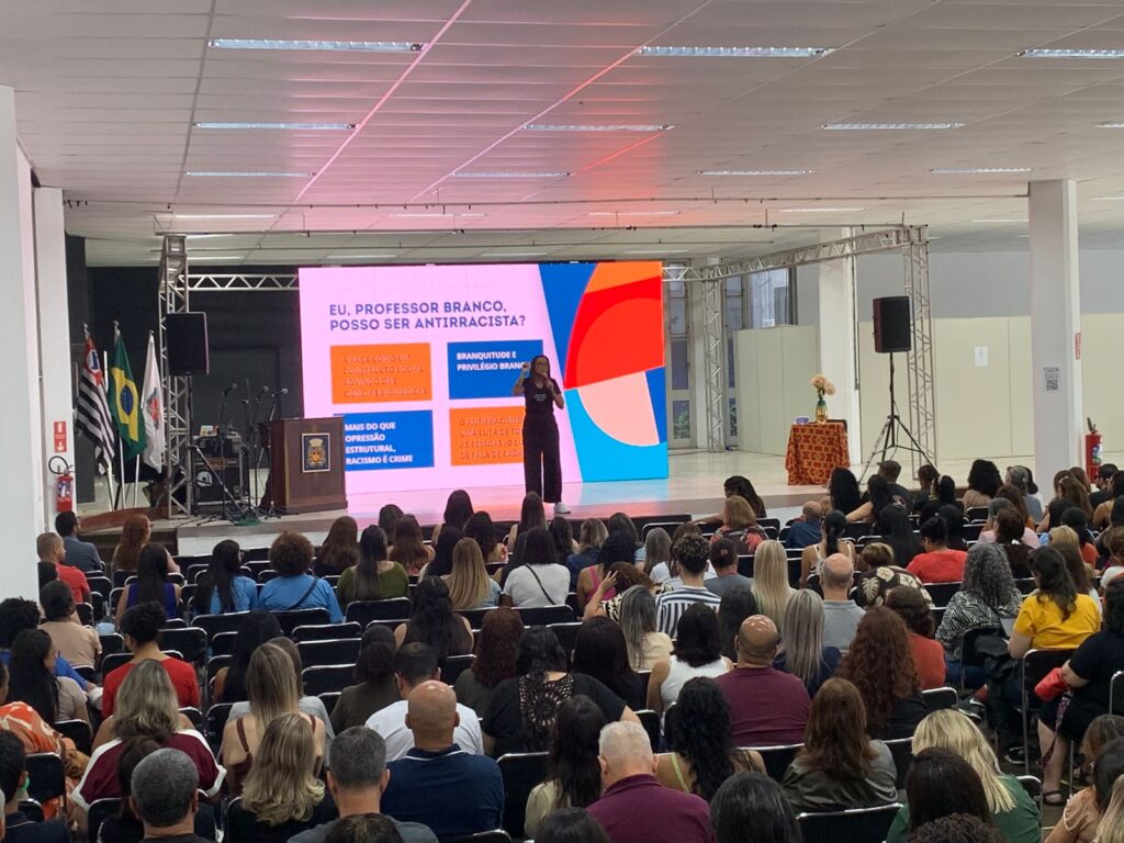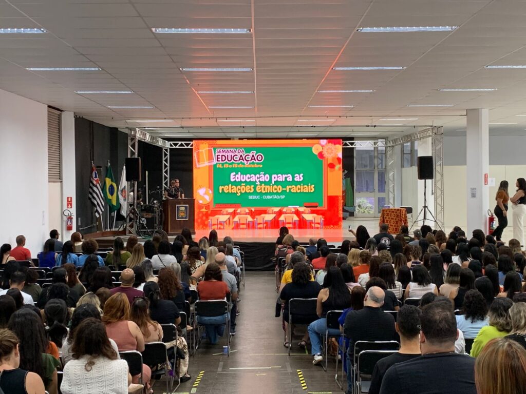 A Semana da Educação de Cubatão começou com força total nesta terça-feira (14), reunindo 600 professores da rede municipal de ensino no Bloco Cultural durante a manhã e a tarde. Neste primeiro dia, o clima foi de aprendizado, acolhimento e troca de experiências. O evento, que segue até quarta-feira (16), traz uma programação intensa com palestras, oficinas e atividades formativas que colocam no centro da discussão o letramento racial e a educação antirracista reunindo pelo menos 2.500 educadores. É realizado pela Prefeitura, via Seduc e Centro de Capacitação Profissional e Formação Continuadas (Capfc).